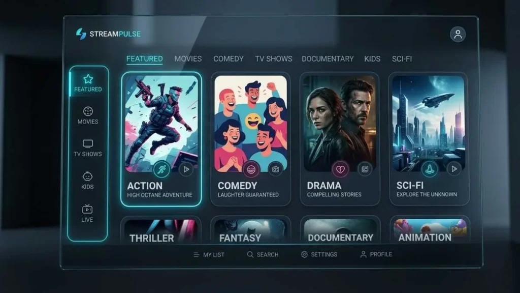 The search feature allows users to find specific titles quickly, while categorized browsing helps in discovering new content. Sections such as popular or recently added titles guide users toward trending entertainment options.