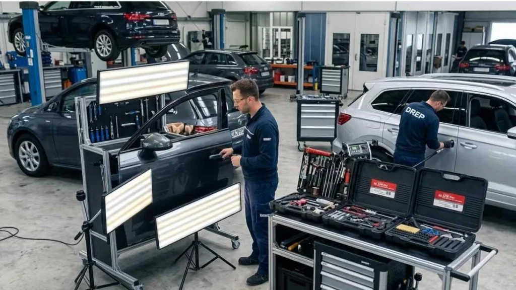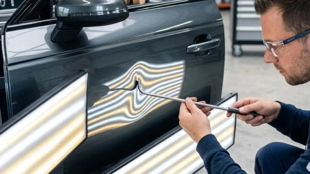 Low-speed collisions sometimes create small metal distortions that do not damage the paint. In such cases, a professional dent repair station allows technicians to restore the panel with careful metal manipulation.