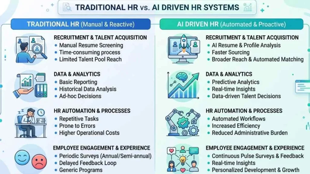 Below is a simplified comparison between traditional HR systems and AI-enhanced HR transformation platforms: