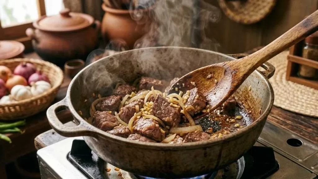 This classic Filipino stew recipe begins by browning chunks of meat with onion and garlic, then simmering them with vegetables, broth, chile, and bay leaf until the meat becomes tender. Some variations add tomato sauce, coconut milk, or annatto oil to create a warm orange color and richer flavor. Pollaste remains a comforting home-style dish that represents traditional Filipino cooking and family meals.