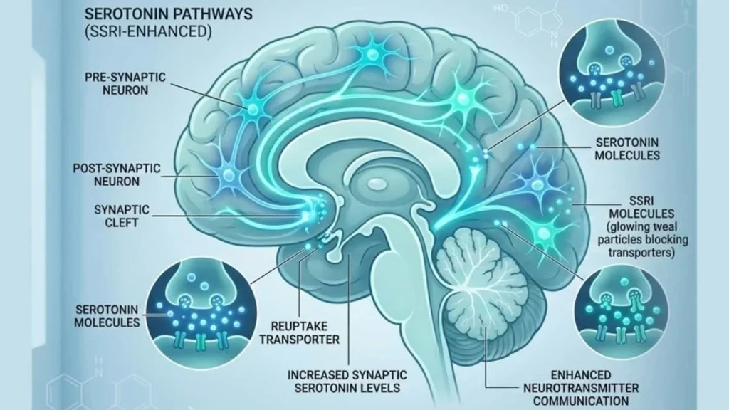 As a result, more serotonin remains available between brain cells, allowing better communication within mood-regulating pathways. Over time, this process supports improved mental stability and reduced anxiety symptoms.